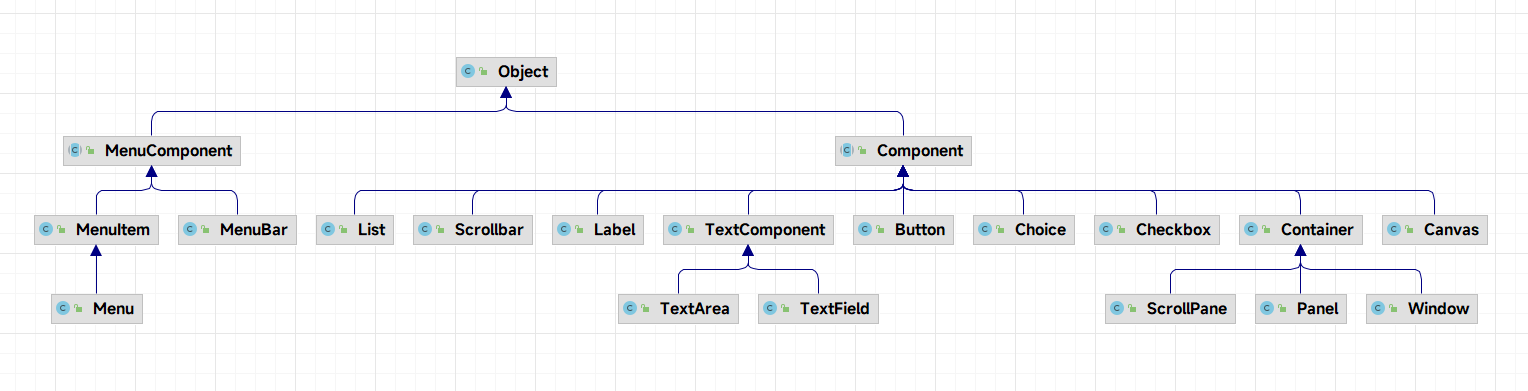 - ① Component:代表一个能以图形化方式出现出来,并且可以和用户交互的对象(组件),如:Button 代表一个按钮,而 TextField 代表一个文本框。