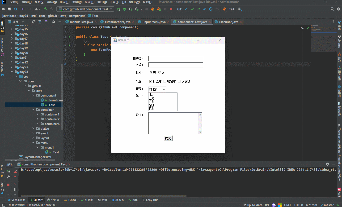- AWT 工具包,包括:GUI 组件、用于在屏幕上调整这些组件大小和位置的布局管理器,以及用于处理来自这些组件的事件的类。AWT 还提供对字体、颜色、图像、数据传输、拖放以及 2D 和 3D 几何图形的支持。