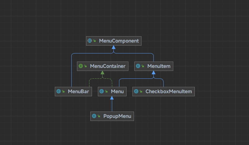 - ② MenuComponent:代表图形界面的菜单组件,如:MenuBar 代表菜单条,而 MenuItem 代表菜单项。