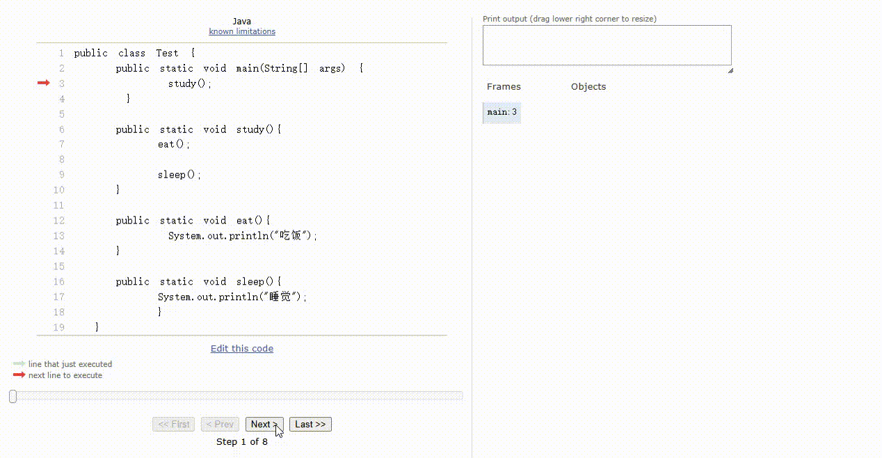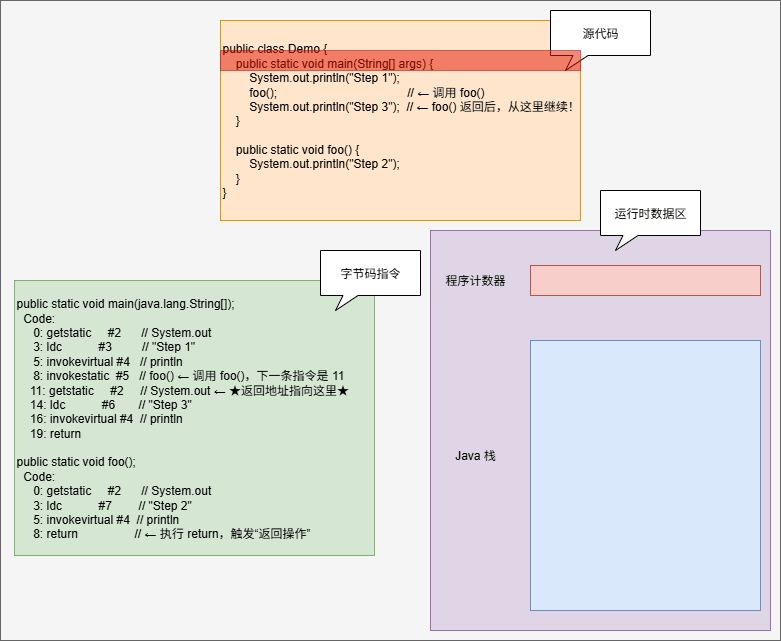 System.out.println("Step 3"); // ← foo() 返回后,从这里继续!