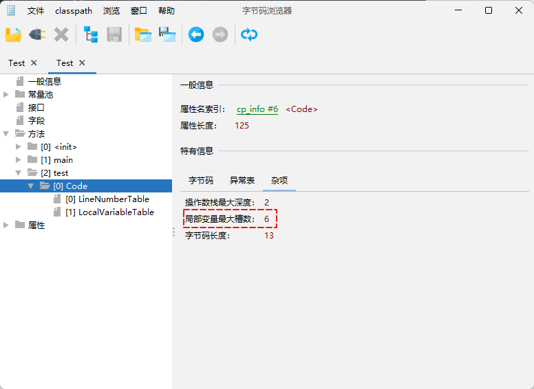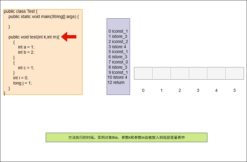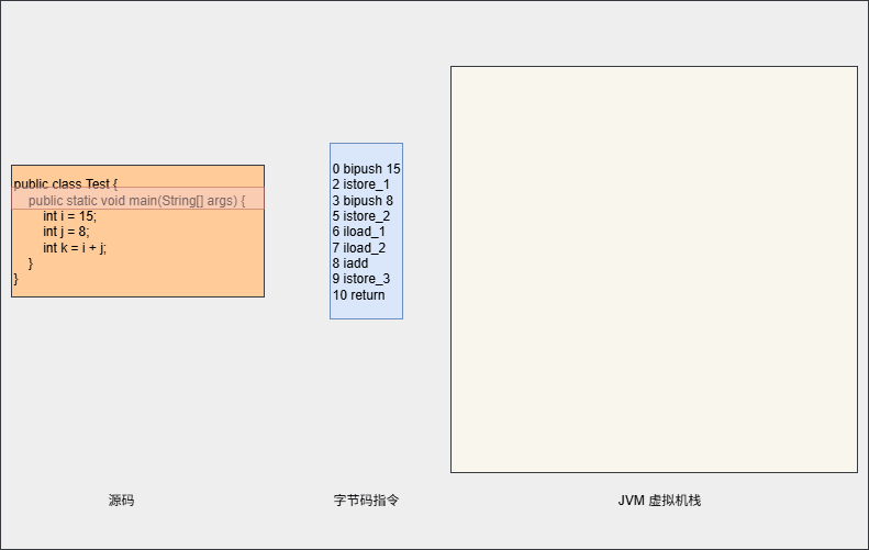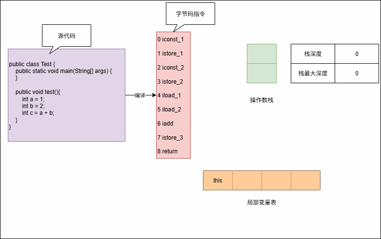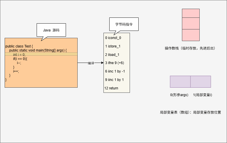 - 当字节码指令被加载到内存的时候,会在 Java 虚拟机栈中形成两个内存区域,即: