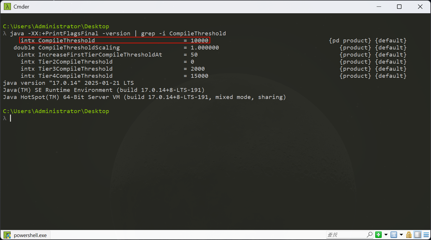 java -XX:+PrintFlagsFinal -version | grep -i CompileThreshold